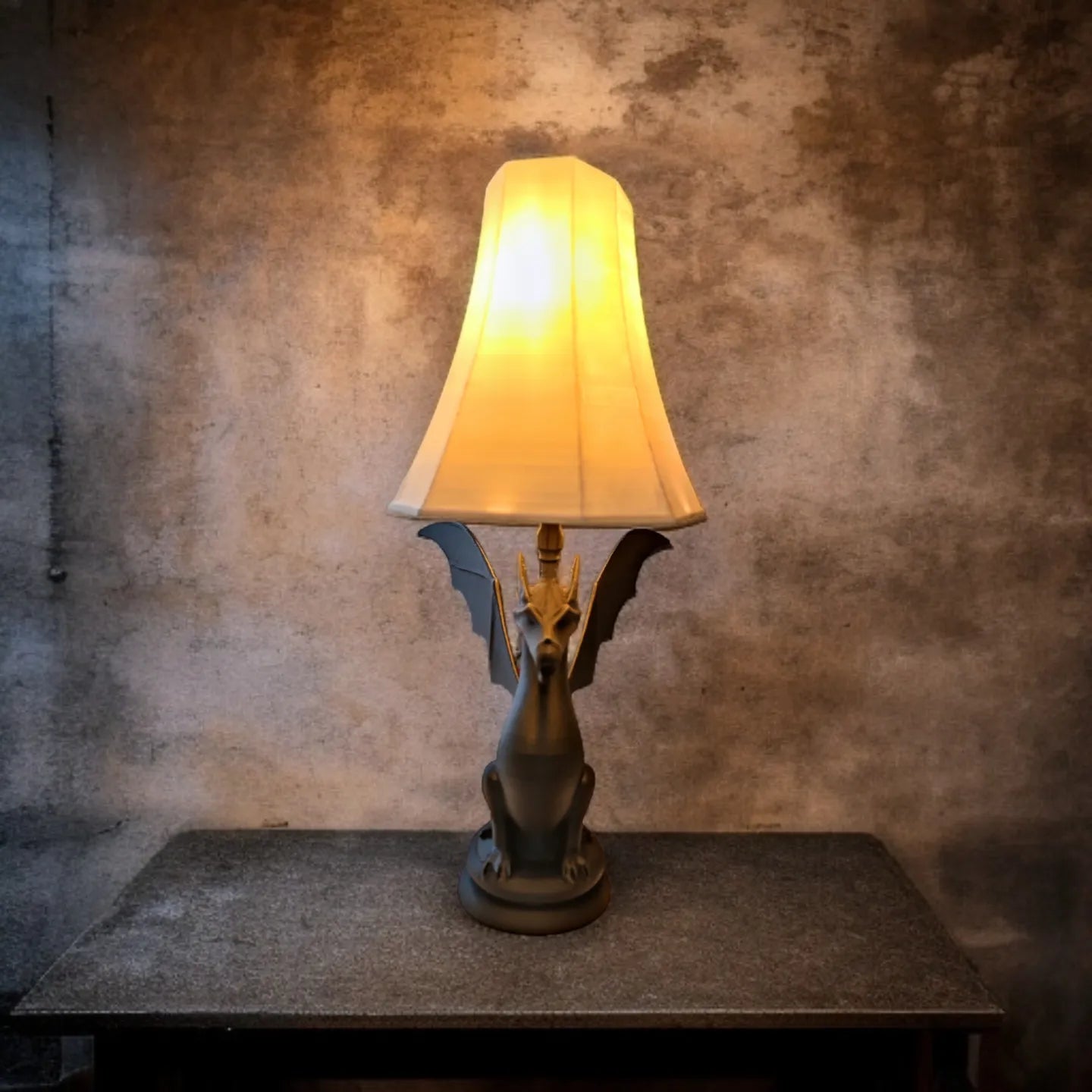This is not merely a lamp; it is a work of sculptural art. The base features a magnificently detailed gargoyle, with powerful wings unfurled to support the classic lampshade. Its commanding presence and dark, stone-like finish make it a formidable statement piece, perfect for lovers of gothic architecture, dark academia, and epic fantasy.
