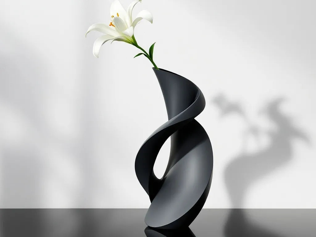 Inspired by the graceful unfurling of a ribbon, this vase features a seamless, twisting form that is both powerful and serene. Its continuous loop creates a dynamic silhouette that changes with every viewing angle, playing with light and shadow in a captivating dance. The deep, matte black finish gives it a profound, sculptural presence, making it a sophisticated centerpiece in any minimalist or contemporary interior.